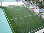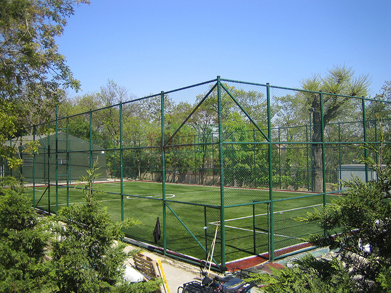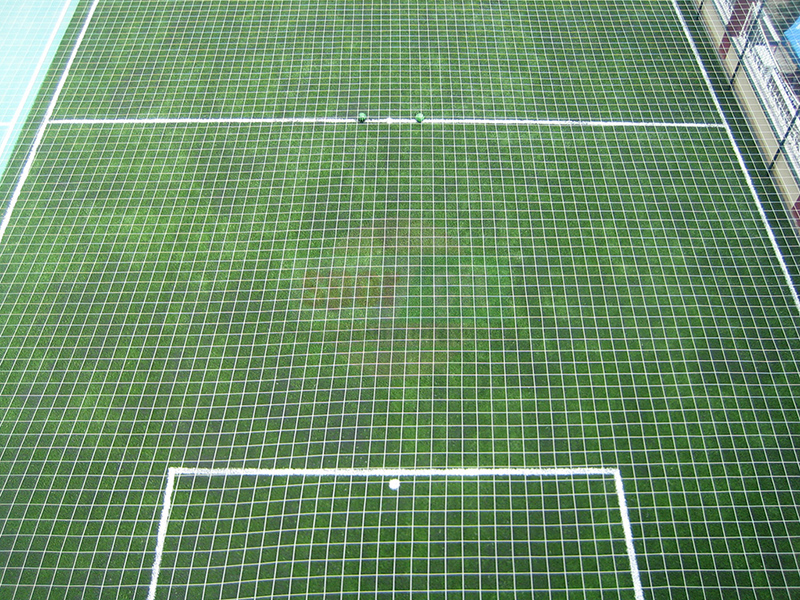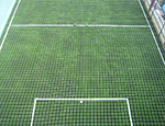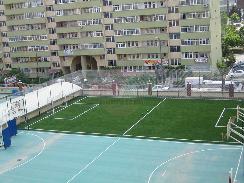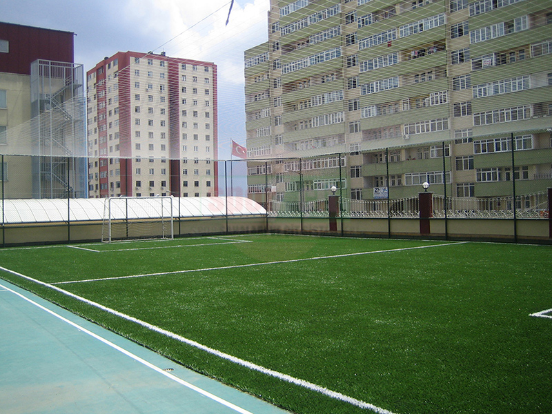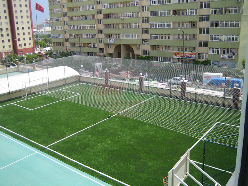 Sahanın üzerine topun dışarıya kaçmaması için 15x15cm göz aralığında 66 numara ithal ipten mamul üst kapama ağı,tel çit direklerine bağlanarak montaj yapılır.